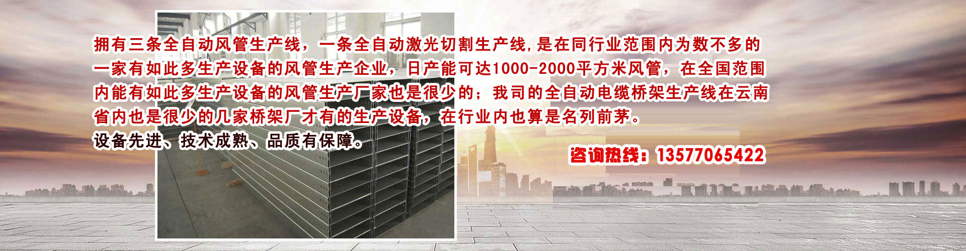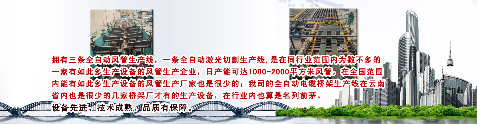 拥有三条全自动风生产线Q一条全自动Ȁ光切割生产线,是在同行业范围内为数不多的一家有如此多生产设备的风管生企业Q日产能可达1000-2000qx(chng)c风,在全国范围内能有如此多生产设备的风管生厂家也是很少的;我司的全自动늼桥架生U在云南省内也是很少的几家桥架厂才有的生产设备,在行业内也算是名列前茅?